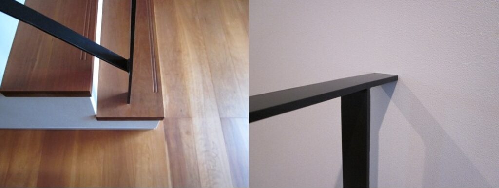 床材やクロスの下でビス止めしていて、床や壁から手摺が生えているような感じ。
